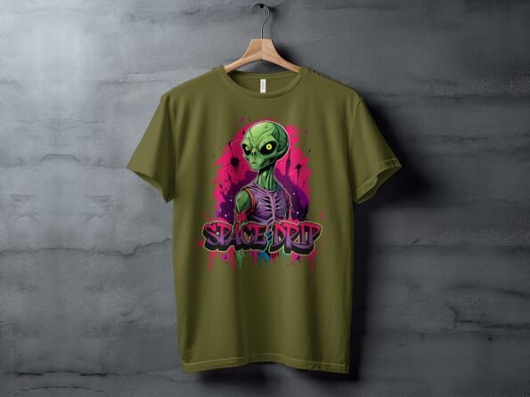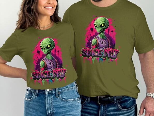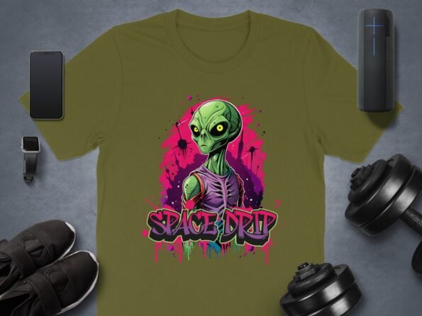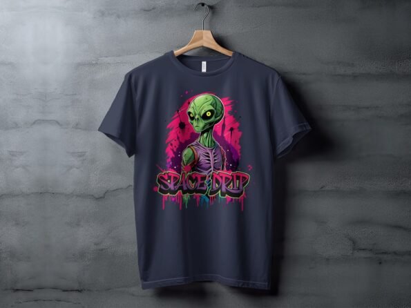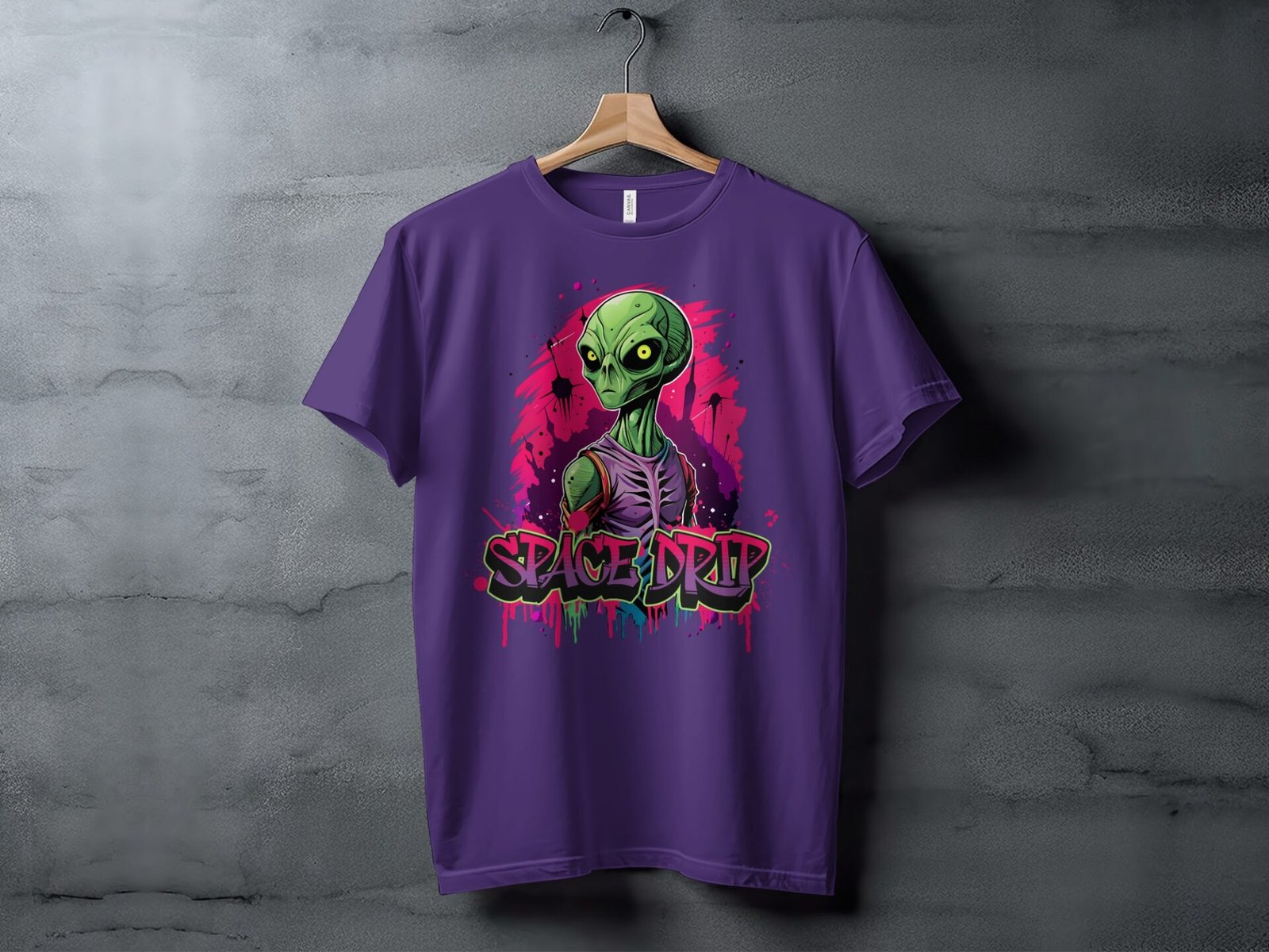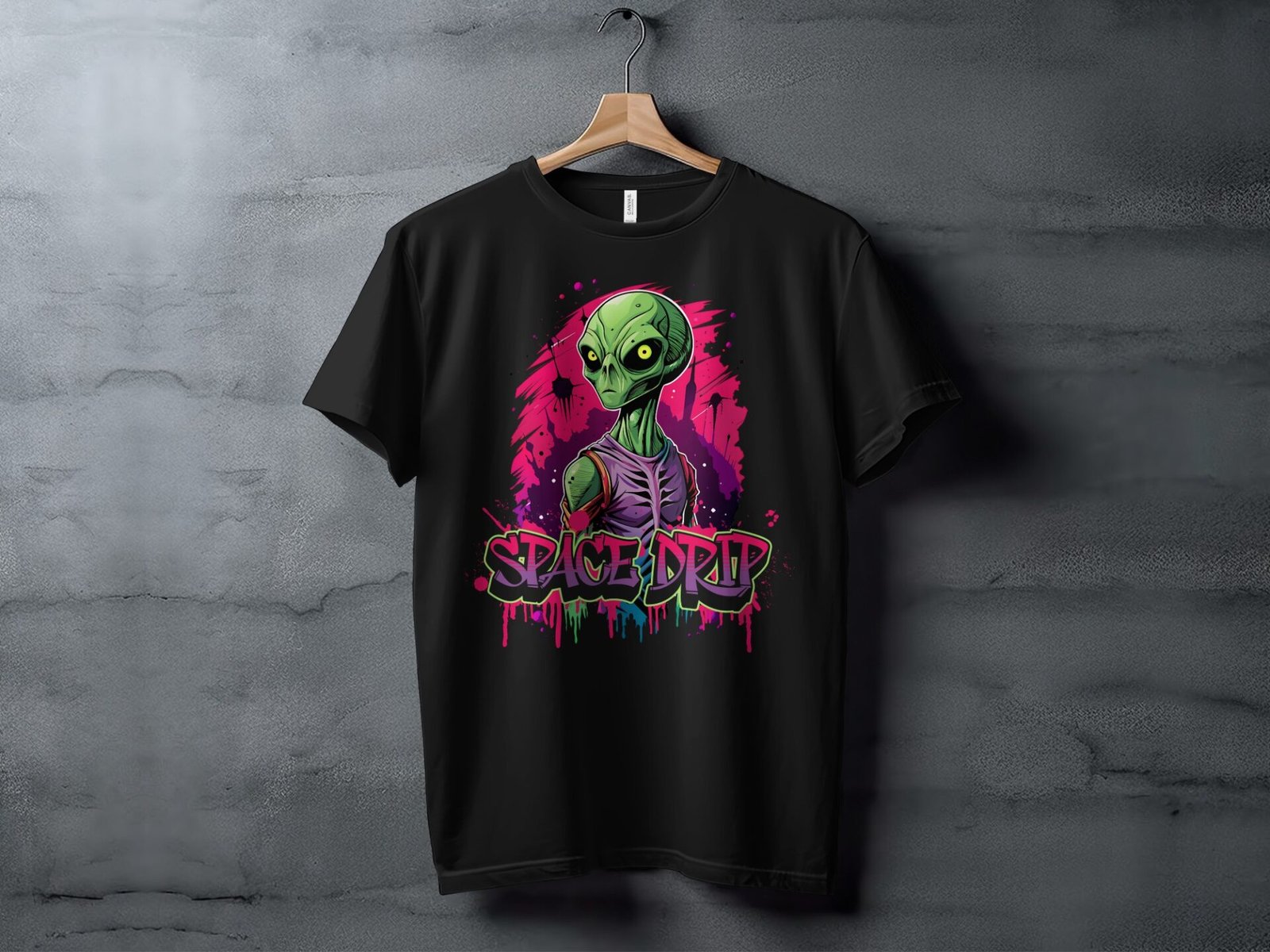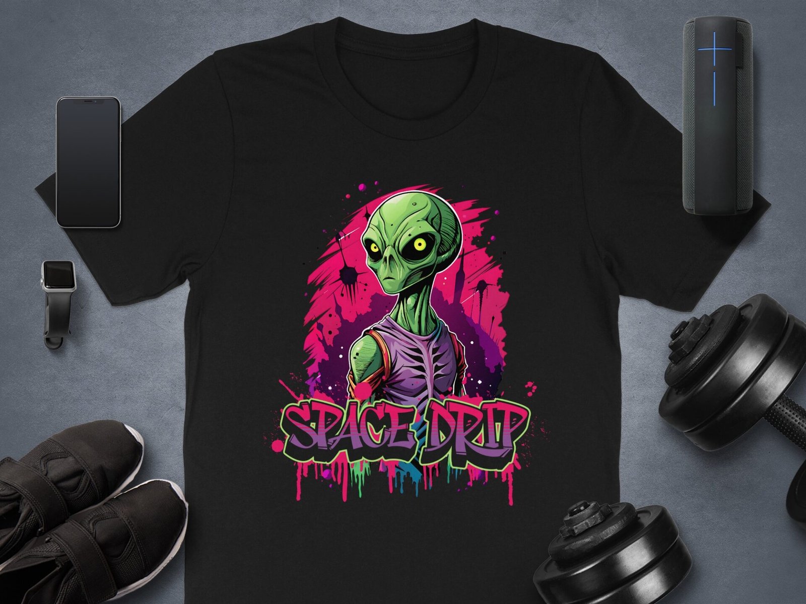 Embrace cosmic cool with this Space Drip alien T-shirt. Featuring a graffiti inspired design this shirt is perfect for anyone who loves extraterrestrial art and street style vibes.