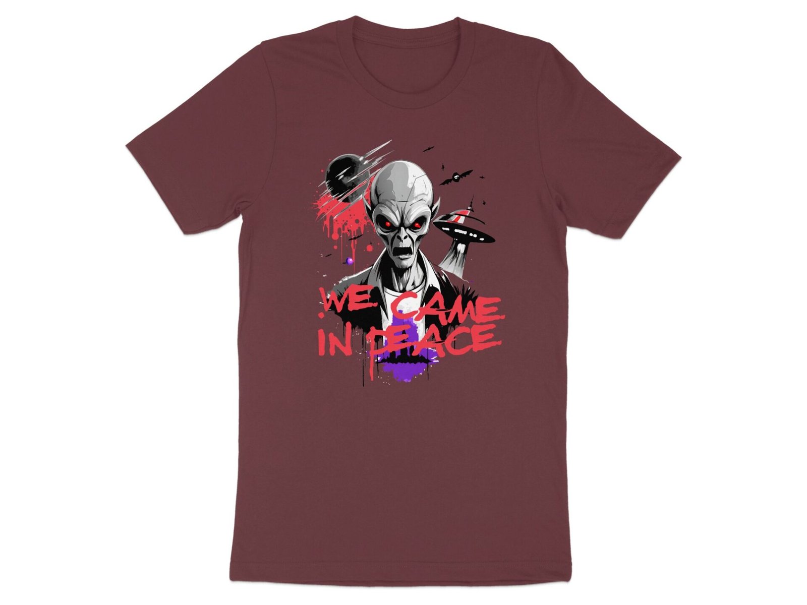 Explore our unique T-Shirt featuring an alien with red eyes and a spaceship. The phrase “We Came in Peace” adds an ironic touch to this spooky yet cool design. Get yours now!